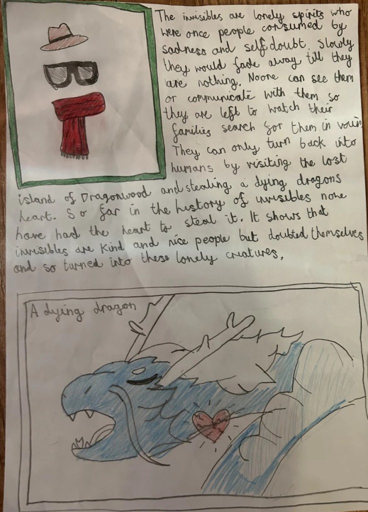 All of the work on villains, heroes and settings allowed us to recap similes, metaphors, sentence structure, powerful vocabulary and much more. Most of this was done through discussion which helped take away the stigma for some of the less confident members, it was noticeable how they were happier joining in with these very relaxed discussions and it was beneficial to their writing and most importantly their thought process. No longer were they settling for the first thing that came to mind, they were looking at what they’d written and taking time to try and find the best word or structure to support that.