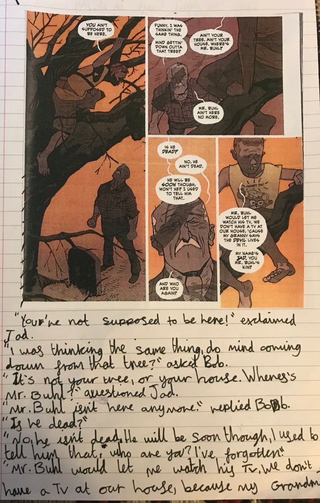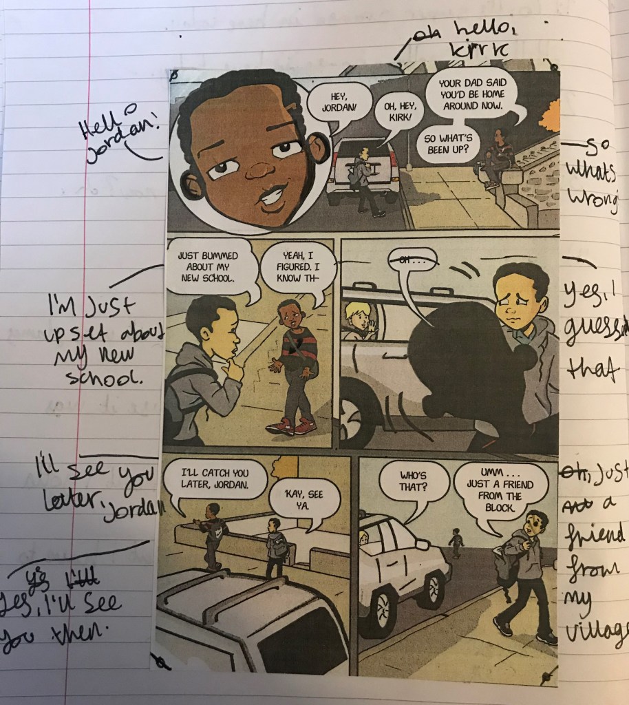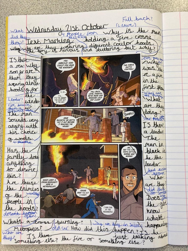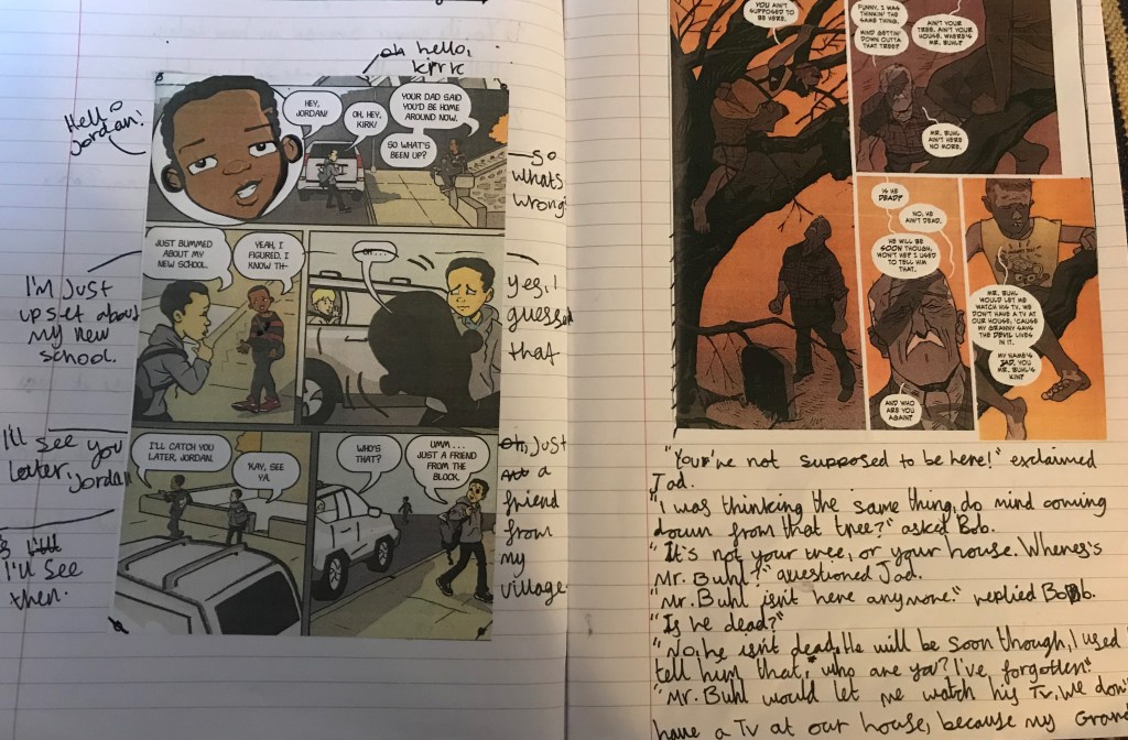 The best examples were all brilliant for different reasons. Some experimented with different sentence lengths to create atmosphere. Others used powerful metaphors or more ambitious vocabulary to create an engaging comic. Knowing that they weren’t allowed to draw their images until they had written out what they needed meant the class was incredibly focused on their work and desperate to produce the very best they could. I won’t lie it was really enjoyable to see how excited they were when I told them they had time in the afternoon to carry on with their comics, you could see how much they cared about the quality of their work. One boy who can’t stand art and was angry at first ended up creating his best writing of the year because he focused so intently on making sure each box said what he wanted it to. He then worked with another boy who loved drawing and explained how he wanted the images to look, some may say this was too much of a compromise but actually whether he can draw or not doesn’t matter when it comes to his English work. He was tasked with creating a detailed story in only seven panels and he did, most importantly he was proud of his work which is a rare occurrence for him in English lessons.