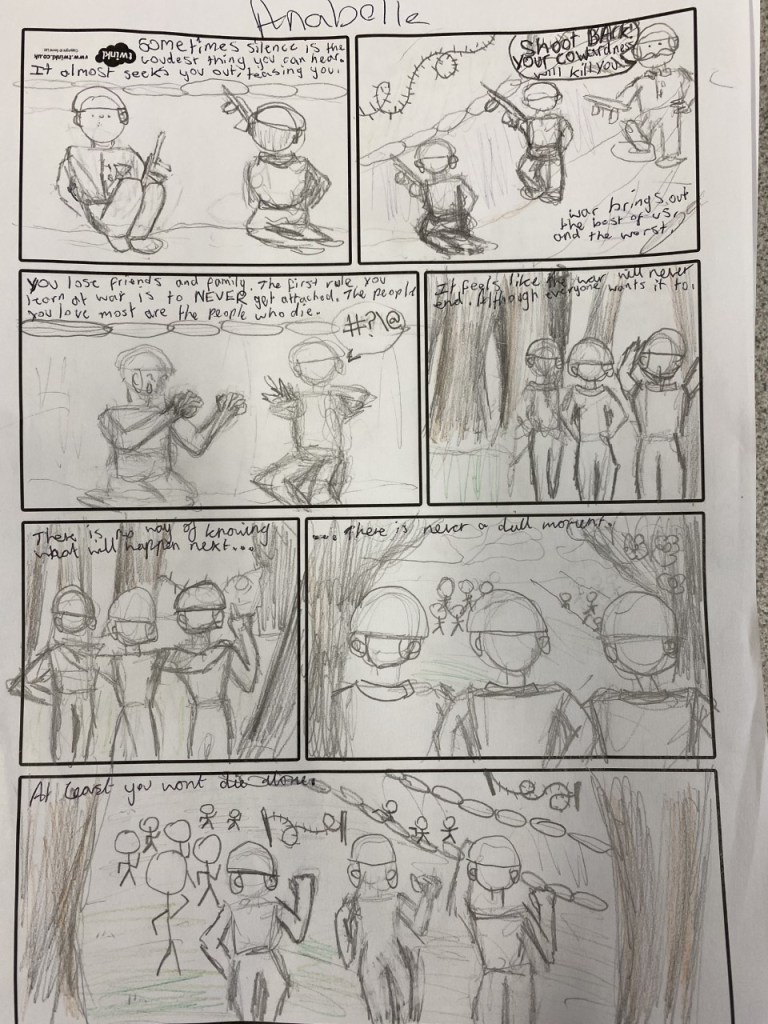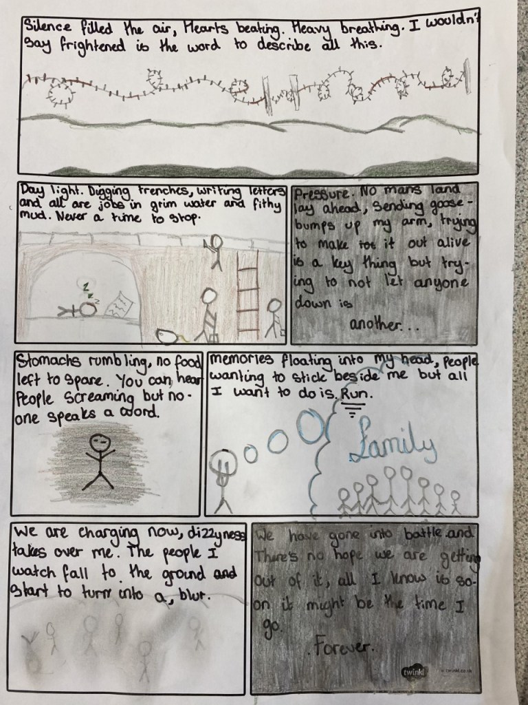 In order to do this we had to look at excellent examples of descriptive writing in Private Peaceful. This allowed us to discuss the power of figurative language and how it can allow us to create incredibly powerful writing in very few words. Although they would have imagery to support their words we all agreed as a class that their language needed to be the star of each panel. It was no good having stunning images and lacklustre writing. Of course not all of them found this easy and some still finished with work that was far too generic and full of ‘and then we got out of the trench and then we went into no mans lad’ style writing. But for those children who really pushed themselves and applied what we discussed, planned and modelled together there was some truly stunning writing.