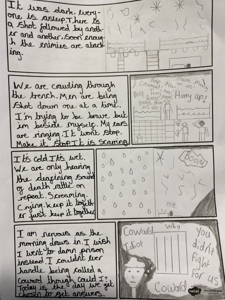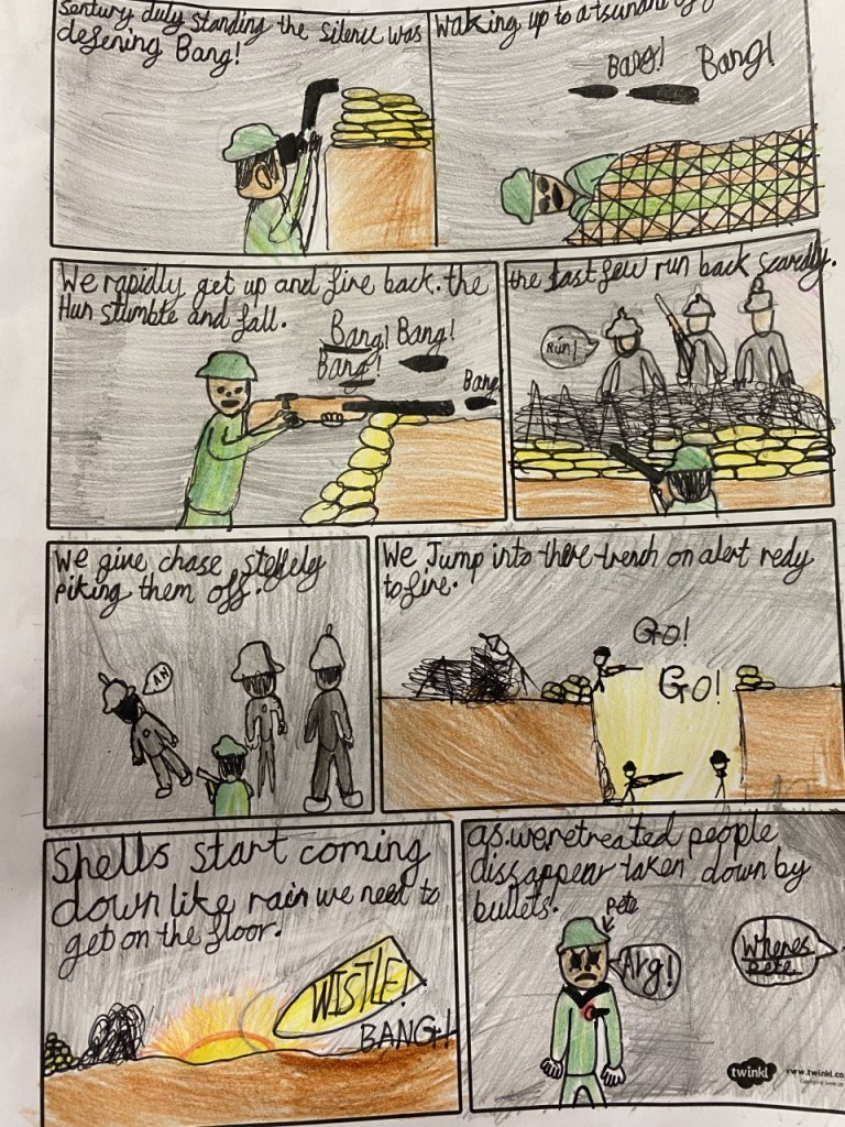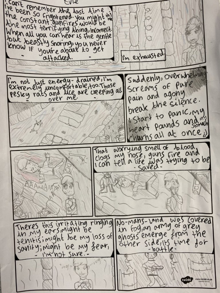 Over the past term we have been learning about World War One and our English work has all been based on the superb novel Private Peaceful by Michael Morpurgo. Ordinarily, I would use a graphic novel or comic to help children improve their writing and look at how can we expand on detail or structure. However this week I decided to work the opposite way. We used Private Peaceful as inspiration to create our own comic strips based on being stuck in the trenches. Instead of writing long flowing paragraphs about the atrocities of war the children were tasked with communicating how horrendous they were in a matter of only a few lines and only seven panels. They were allowed to split the panels up into smaller ones if they wanted but they couldn’t have another sheet, the key was to be succinct with their writing and create the most impact possible in the least amount of space. Unlike this intro there was no space for them to waffle.